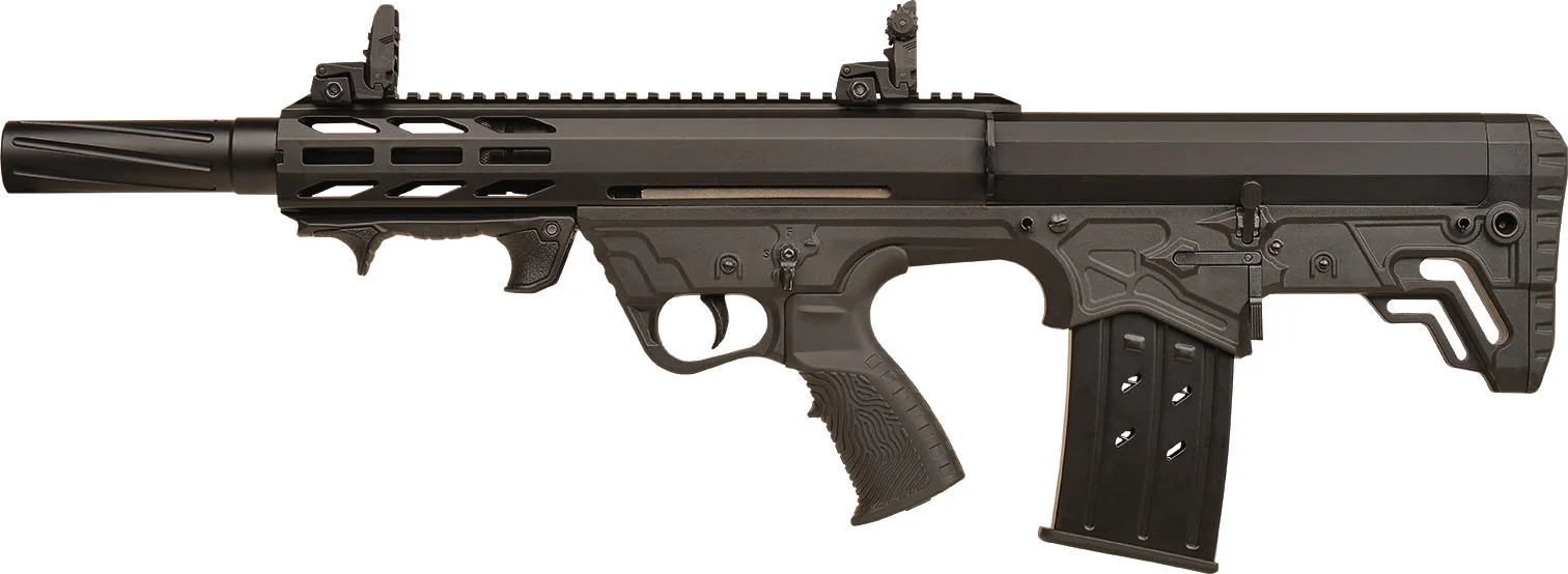 The GFY-1 bullpup shotgun is compatible with MKA-1919 magazines and accepts 2 3/4 and 3-inch 12ga ammo. The GFY-1 features adjustable flip-up sights, as well as a bottom Picatinny rail for mounting accessories. Red dots and reflex sights can also be installed on the GFY-1 for faster target acquisition.